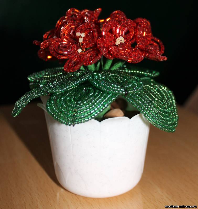 | Анира, Ирочка, чтобы сделать эту фиалочку, нужно: бисер, проволока 2 видов, гипс, горшочек и флорлента или ниточки мулине для обмотки. Само плетение очень простое. Если будут желающие с удовольствием научу, чуть попозднее покажу еще другую фиалочку, она побольше