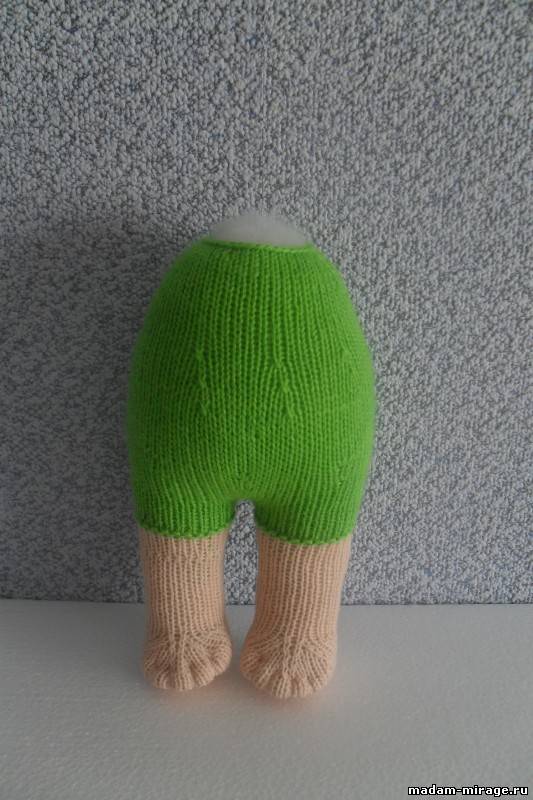 Ноги и тело Правая нога Телесным цветом набрать 40п и провязать 4 ряда ЛГ Формирование ступни: След.ряд: 31 лиц.п, нить перед работой, 1п снять не провязывая, нить за работой, повернуть След.ряд: 1п снять не провязывая, 22 изн.п, нить за работой, 1п снять не провязывая, нить перед работой, повернуть След.ряд: 1п снять не провязывая, 3 лиц.п, (2 вм, 4 лиц.п, skpo) дважды, 2 лиц.п, нить перед работой, 1п снять не провязывая, нить за работой, повернуть След.ряд: 1п снять не провязывая, 16 изн.п, нить за работой, 1п снять не провязывая, нить перед работой, повернуть След.ряд: 1п снять не провязывая, 2 лиц.п, (2вм, 2 лиц.п, skpo)дважды, 1 лиц.п, нить перед работой, 1п снять не провязывая, нить за работой, повернуть След.ряд: 1п снять не провязывая, 10 изн.п, нить за работой, 1п снять не провязывая, нить перед работой, повернуть След.ряд: 1п снять не провязывая, 1 лиц.п, (2вм, skpo)дважды, лиц.п провязать до конца След.ряд: изнаночные петли до конца ряда (28) След.ряд: 1 лиц.п,skpo, 2вм, 7 лиц.п, skpo, 2вм, 7 лиц.п, skpo, 2вм, 1 лиц.п (22) 3 ряда ЛГ Формирование ноги(выше ступни): Прибавить по 1п в начале следующих 4 рядов (26) 6 рядов ЛГ По 1 убавке в начале следующих- 4 рядов (22) Прибавить по 1п в начале следующих 6 рядов (28) Нить поменять на зеленый цвет купальника и провязать 2 ряда платочной вязки и 2 ряда ЛГ прибавляя по 1п в начале каждого ряда (32) Нить поменять на желтый цвет купальника и провязать один ряд прибавляя по 1п в начале и конце ряда(34) Набрать 8п и провязать изнаночными петлями до конца ряда(42) Закрыть 8п, оставшиеся 34п отложить на дополнительную спицу. Левая нога Телесным цветом набрать 40п и провязать 4 ряда ЛГ Формирование ступни: След.ряд: 31 лиц.п, нить перед работой, 1п снять не провязывая, нить за работой, повернуть. След.ряд: 1п снять не провязывая, 22 изн.п, нить за работой, 1п снять не провязывая, нить перед работой, повернуть След.ряд: 1п снять не провязывая, 3 лиц.п, (2 вм, 4 лиц.п, skpo) дважды, 2 лиц.п, нить перед работой, 1п снять не провязывая, нить за работой, повернуть След.ряд: 1п снять не провязывая, 16 изн.п, нить за работой, 1п снять не провязывая, нить перед работой, повернуть След.ряд: 1п снять не провязывая, 2 лиц.п, (2вм, 2 лиц.п, skpo)дважды, 1 лиц.п, нить перед работой, 1п снять не провязывая, нить за работой, повернуть След.ряд: 1п снять не провязывая, 10 изн.п, нить за работой, 1п снять не провязывая, нить перед работой, повернуть След.ряд: 1п снять не провязывая, 1 лиц.п, (2вм, skpo)дважды, лиц.п провязать до конца След.ряд: изнаночные петли до конца ряда (28) След.ряд: 1 лиц.п,skpo, 2вм, 7 лиц.п, skpo, 2вм, 7 лиц.п, skpo, 2вм, 1 лиц.п (22) 3 ряда ЛГ Формирование ноги(выше ступни) Прибавить по 1п в начале следующих 4 рядов (26) 6 рядов ЛГ По 1 убавке в начале следующих- 4 рядов (22) Прибавить по 1п в начале следующих 6 рядов (28) Нить поменять на зеленый цвет купальника и провязать 2 ряда платочной вязки и 2 ряда ЛГ прибавляя по 1п в начале каждого ряда (32) Нить поменять на желтый цвет купальника и провязать один ряд прибавляя по 1п в начале и конце ряда(34) Закрыть 8п, изнаночными до конца ряда, повернуть и набрать 8п. Тело Лицевыми петлями провязать 34п левой ноги и 34п правой ноги Изнаночный ряд Нить поменять на зеленую и провязать 4 ряда зелым цветом и 4 ряда желтым (схема узора купальника). Далее вязать соблюдая схему купальника. След.ряд: 1 лиц.п, (2вм, 29 лиц.п, skpo)дважды, 1 лиц.п (64) Изнаночный ряд След.ряд: 4 лиц.п, (приб., 8 лиц.п)вязать до последних 6п, приб, 5 лиц.п(71) 3 ряда ЛГ След.ряд: 5 лиц.п