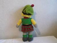 Безрукавка. Перед. (2 одинаковых) Начинайте с боковой кромки и, используя нить тёмно-зелёного цвета, наберите 22 петли. 16 рядов ПВ. Отметим, что одна группа концов ряда будет краем плеча передней части, а другая будет нижним краем. Формирование переднего края. Продолжайте ПВ и убавьте по 1-й петле в начале следующего ряда и в последующих рядах до 13 петель на спице. Следующий ряд. 2 вместе. Закрыть. Спинка. Начинайте с одной стороны края и, используя нить тёмно-зелёного цвета, наберите 22 петли. 16 рядов ПВ. Формирование края шеи. Следующий ряд. (2 вместе) дважды, лицевыми до конца. (20) 33 ряда ПВ. Сл.ряд. Из каждый из первых двух петель вывязать по 2 петли, лиц. до конца ряда (22 петли) Провязать ПВ 16 рядов. Закрыть. Отметим, что две группы концов 16 рядов являются краями плеча. Сшейте через край передние и задние детали по краям плеч. Сшейте через край передние и задние детали по бокам, начиная с 1,5 см от нижнего края жилета. Выверните безрукавку и наденьте на куклу. Шарф. Нитью красного цвета наберите 6 петель. Вяжите ПВ до достижения шарфа длины 30 см. Закройте. Повяжите шарф вокруг шеи куклы как на иллюстрации и завяжите узел. Хаггис. (бараний желудок, начиненный остро приправленным мясным фаршем) - я не вязала Используя нить жёлто-коричневого цвета, свободно наберите 8 петель. Начиная с изнаночного ряда 3 ряда ЛГ. Следующий ряд. Прибавка в каждую петлю лицевыми. (16) 13 рядов ЛГ. Следующий ряд. (2 вместе) до конца. (8) 3 ряда ЛГ. Закрыть свободно. Отмечаем, что изнаночная сторона – это правая сторона изделия. Сшить через край вместе концы рядов. Вывернуть на правую сторону. Нитью жёлто-коричневого цвета по 3-му изнаночному ряду от закрытого края обернуть изделие, сильно стянуть и закрепить нить. Крепко набить через открытый край. Так же нитью жёлто-коричневого цвета по 3-му изнаночному ряду от закрытого края обернуть изделие, сильно стянуть и закрепить нить. Для черт лица использовать черную пряжу. Отметим, что шов находится внизу. Вышить небольшой вертикальный стежок для каждого глаза, а затем вышить стежок на вершине каждого из первых, для того, чтобы сделать глаза больше. Вышить небольшой рот V-формы.