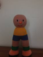 Тело и голова. Отметьте конец каждого следующего ряда цветной нитью. Вяжите с правой лицевой стороны коричневой нитью лицевыми 26 петель левой ноги и 26 петель правой ноги с дополнительной спицы = (52) 15 рядов лицевой глади Оборвите коричневую нить и присоедините светло-жёлтую для верхней части тела. 20 рядов лицевой глади. Формируем плечи. Следующий ряд. 6 лиц, (2 вм лиц) 7 раз, 12 лиц, (2 вм лиц) 7 раз, 6 лиц = (38) Ряд изнаночными. Оборвите светло-жёлтую нить и присоедините телесную для головы. 2 ряда лиц глади. Формирование головы. Следующий ряд 10 лиц, 18 прибавок, 10 лиц = (56) 35 рядов лиц глади. Сл. ряд: (2 вм лиц) до конца = (28) Ряд изнаночными. Следующий ряд. (2 вм лиц) до конца= (14) Стянуть и закрепить