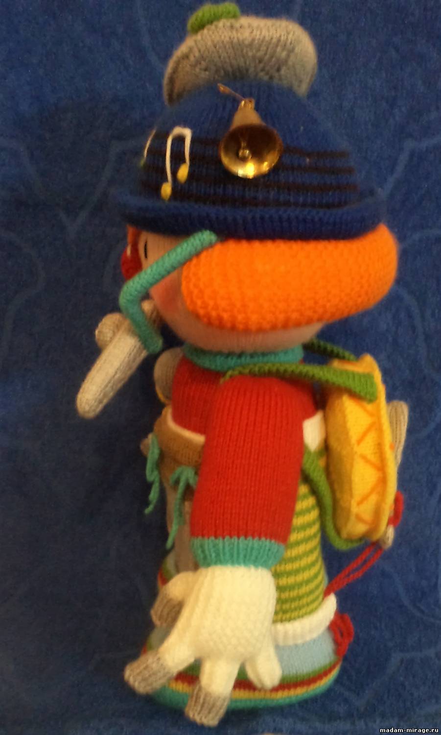 МУЗЫКАЛЬНЫЕ ИНСТРУМЕНТЫ Наперстки (3 шт) Наперстки будут пришиты к пальцам левой руки. Светло-серой пряжей набираем 12 петель. Лицевой гладью 6 рядов. 2 ряда изн.петлями. Нить протянуть через оставниеся петли и стянуть. Сшиваем вместе боковые края наперстков. Надеваем их на пальчики и пришиваем. Гудок-рожок Начните с верхнего узкого конца оранжевой нитью набрать 12 петель. Начиная изн.рядом вяжем 5 рядов лицевой гладью. След.ряд: (2 лиц, 1 прибавка)- повторять до конца (16 пет) Лицевой гладью 7 рядов. След.ряд: (3 лиц, 1 прибавка)- повторять до конца (20 пет) Лицевой гладью 6 рядов. След.ряд: лицевые петли (отмечаем внешний край). Меняем оранжевый цвет на серый и начиная с лиц.ряда провязываем лиц.гладью 2 ряда. След.ряд: (2 лиц, 2 вм.лиц) – до конца (15 пет) След.ряд: изн.п. След.ряд: (1 лиц, 2 вм.лиц) – до конца (10 пет) След.ряд: (2 вм. изн) – до конца ( 5 пет) Нить, протянуть через оставшиеся петли, стянуть, закрепить. Сшиваем боковые края. Вырезаем круг из картона диаметром 3,5 см и помещаем в основание детали. Набиваем деталь и сшиваем до конца. Отложили пока. Круглая деталь гудка. Начинаем с нижнего края серой нитью, набираем 9 петель. 1 ряд изн. След.ряд: из каждой петли вывязываем 2 лиц. 1 изн.ряд. След.ряд: (1 лиц, 1 прибавка) – повторять до конца (27 пет) 11 рядов лиц.гладью След.ряд: (1 лиц, 2 вм.лиц) – повторить до конца (18 пет) 1 изн.ряд. След.ряд: (2 вм.лиц) – до конца – 9 пет. Нить протянуть через оставшиеся петли, затянуть, закрепить. Сшиваем и набиваем. Пришиваем стянутый набранный конец круглой детали к открытому верхнему краю отложенной детали. Делаем крученый шнур из желтой пряжи и пришиваем на пояс. Свисток Основная деталь Светло-серой нитью набираем 12 петель и провязываем 18 рядов лицевой гладью. Убавляем по 1 петли с обоих сторон (10 пет) Лицевой гладью 9 рядов. Нить протянуть через оставшиеся петли и стянуть. Вырезаем 2 одинаковые картонные детали. (см. в 5 этапе) Сшиваем вместе боковые края вкладывая во внутрь вырезанные детали, набивая между деталями. Сшиваем набранные края. Верх: Белой нитью набираем 10 петель. Нить, протянуть через петли и затянуть. Получился кружек, который нужно пришить сразу на широкую часть детали свистка. Теперь светло-серой нитью набираем 14 петель и провязываем 3 ряда лицевой гладью. След.ряд: лиц.петли (для линии сгиба) Начиная с лиц.ряда вяжем 3 ряда лиц.гладью. Лицевой стороной наружу сшиваем набранный и закрытый края, затем боковые края. Пришиваем сшитый край к свистку, прямо сверху на белый кружек. Кронштейн Для кронштейна понадобится коктейльная трубочка со сгибающейся частью. Отрезаем длинную часть, чтобы длина была 5 см. Короткую часть не трогаем. Берем нить бирюзового цвета, набираем 30 петель, провязываем лицевой гладью 6 рядов. Закрываем петли. Сшиваем боковые края полученной детали постепенно вкладывая трубочки. Пришиваем свисток к кронштейну, а кронштейн крепим к шляпе.