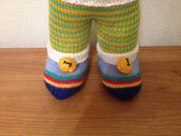 Ботиночки (2 детали) Начиная с нижнего края и используя нить темно-бирюзового цвета набираем 48 петель. 1 ряд: прибавка в первые 2 петли, 20 лиц, прибавка в следующие 4 петли, 20 лицевых, прибавка в последние 2 петли (56 петель) 1 изнан. ряд След.ряд: (1лиц, 1 прибавка) – до конца ряда (84 петли) 4 ряда лицевой гладью Теперь 4 ряда резинкой (1лиц, 1 изнан.) 1 ряд лицевыми Меняем нить на золотую и вяжем 2 рядов лицевой гладью. Меняем нить на красную и вяжем 2 ряда лицевой гладью. Меняем нить на зеленую и вяжем 2 рядов лицевой гладью. Меняем нить на голубую и вяжем 4 рядов лицевой гладью. Продолжаем голубой нитью…. След.ряд: 26 лиц, (1 п. снять, 1 лиц, протянуть через снятую)-16 раз, 26 лиц (68 петель) 1 ряд изнан. След.ряд: (2 вместе лиц) – 2 раза, 26 лиц, (2 вместе лиц) – 4 раза, 26 лиц, (2 вместе лиц) – 2 раза (60 петель. 1 ряд изнан. След.ряд: (2 лиц, 2 вместе лиц) – до конца (45 петель) Петли закрыть, отметить маркером центр закрытого края. Вырезать из плотного картона подошвы обуви и вставит в ботинки, сшить и сильно набить. (Сшиваем нижнюю часть ботинок. Верхнюю часть ботинок сшиваем от маркера только на 2,5 см, остальное оставляем открытым, для дальнейшего соединения с ножкой) Пришиваем ботиночек к ножке по выделенной полосе (изнаночный ряд на лицевой глади) Я картон не вставляла! Так что если кто-то не хочет этого делать – это не так важно!