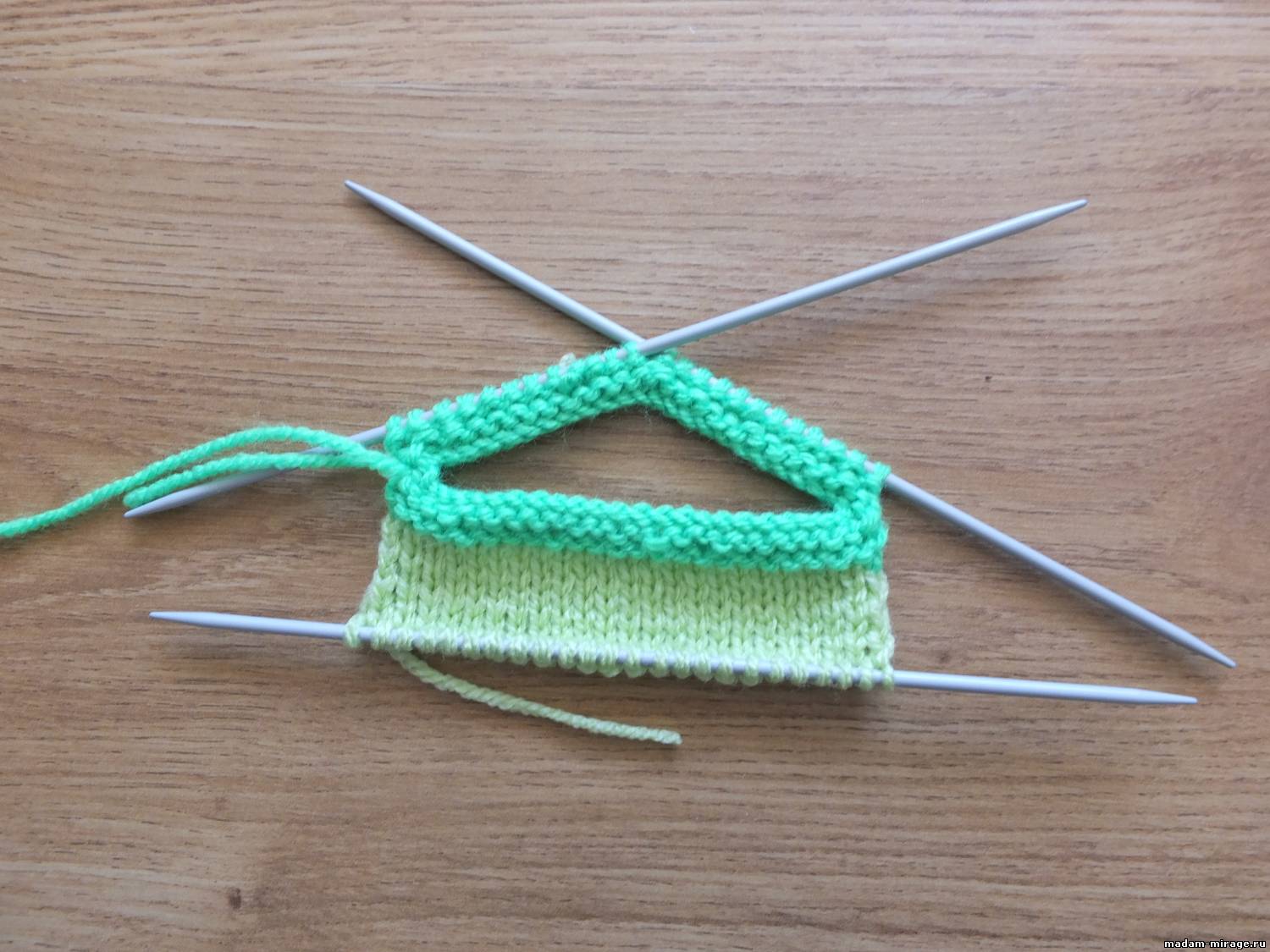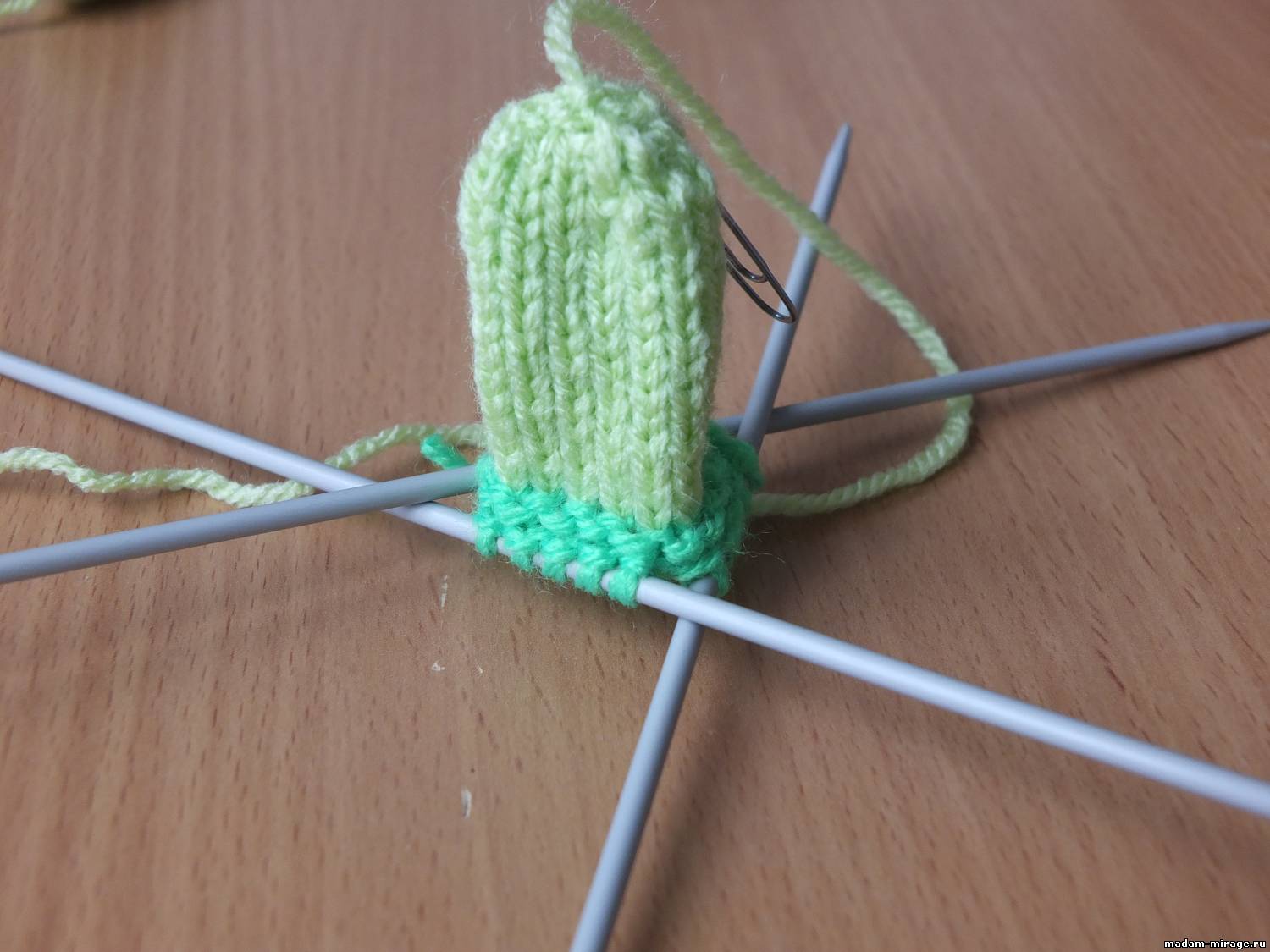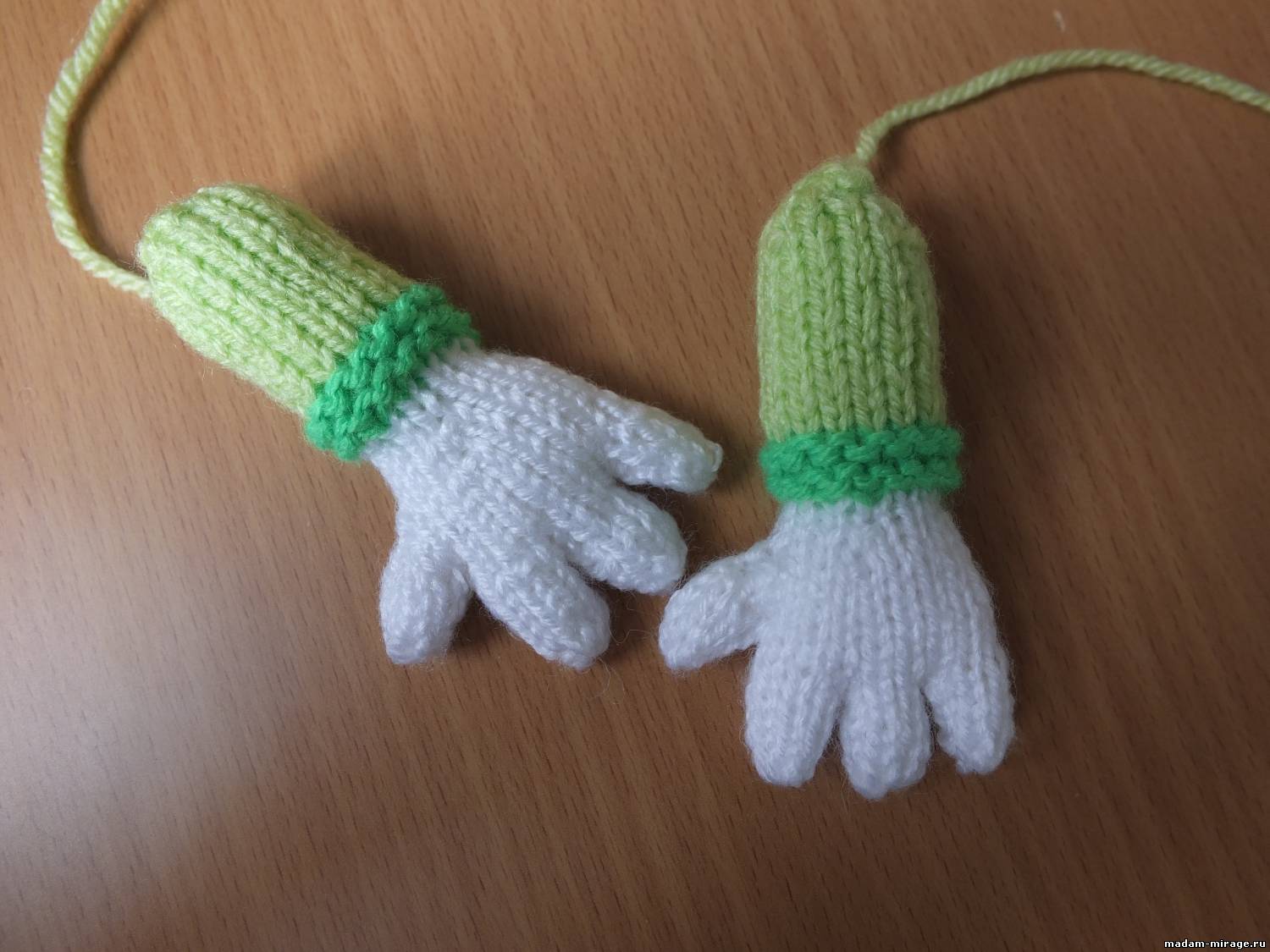 Набиваем в процессе вязания, в пальчиках петли не стягивайте пока через них вы будите добивать ручку и пальчики. Описание для 4х СП. кто вяжет на 2х- просто не замыкайте в круг. Набрать светло - салатовым цветом цветом 3п. Теперь не провязывая ряд сразу делаем прибавки. ( из 1п. вывязываем 2).= 6п. 1р.-( пр).-6 раз =12п. 2р.- лиц.п. (для 2х спиц. изн.п) =12п. 3р.- (3лиц, пр)- 3 раза =15п. 4-12р.- прямо - лиц.п. ( для 2х спиц четные ряды-изн.п) Меняем цвет на темно салатовый. (это наша отделка)и вяжем платочную вязку. (Как на штание) 13,14,16р.- лиц.п 15,17р.-изн.п Снова меняем цвет теперь на белый для ладошки. 18р.- ( 3 лиц, уб)- 3 раза =12п. ( кто вяжет на 2х СП, то у вас изн.п) 19,20р.-прямо лиц.п.=12п. ( для 2х СП. 19р.-лиц.п, 20р.- изн.п) 21р.- ( пр, 3 лиц)- 3 раза =15п. 22р.- =15п 23р.- ( пр, 4 лиц)- 3 раза =18п. 24р.- =18п 25р.-начинаем вывязывать большой палец: 3 лиц, (пр.из протяжки, 1 лиц, пр.из протяжки), 14 лиц =20п 26р.- 4 лиц, (пр.из протяжки, 1 лиц, пр.из протяжки), 15лиц =22п (кто вяжет на 2х СП, то у вас изн.п) 27р.- 5 лиц, (пр.из протяжки, 1 лиц, пр.из протяжки), 16 лиц =24п 28р.- 3 лиц, ( 7п. снять на доп.спицу-это большой палец), 14 лиц =17п. (кто вяжет на 2х СП, то у вас изн.п) Когда вы снимите петли старайтесь что бы петли ( 3 лиц и 14 лиц. ) были связаны плотно друг к другу. Эти петли мы сейчас будем вязать 29р.- 4лиц, пр, ( 5 лиц, пр)- 2 раза =20п. 30р.- 20 лиц.п . ( кто вяжет на 2х СП, то у вас изн.п) Петли для пальчиков распределим так: - большой -7п (вязать будем 3 ряда.) -указательный -7п (вязать будем 4ряда.) -средний -7п (вязать будем 5ряда.) - мизинец – 6п. (вязать будем 4ряда.) (для 2Х СП. Вяжем прямо потом вы их будите сшивать).