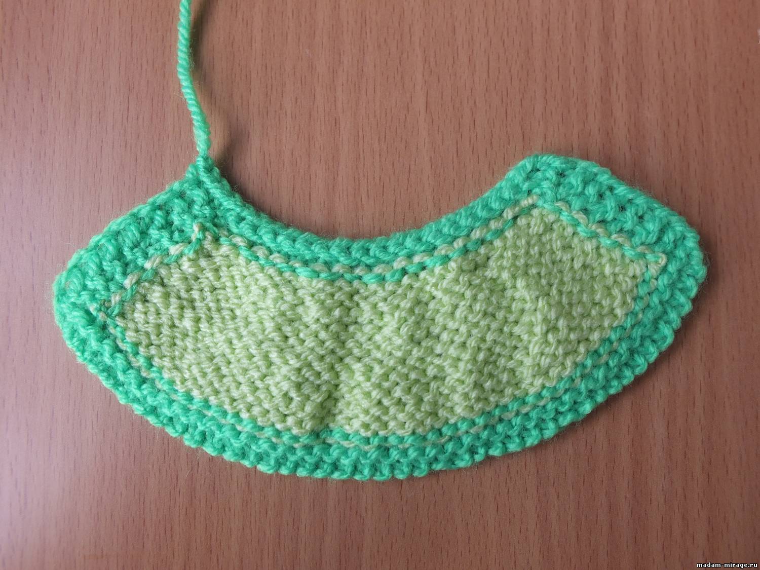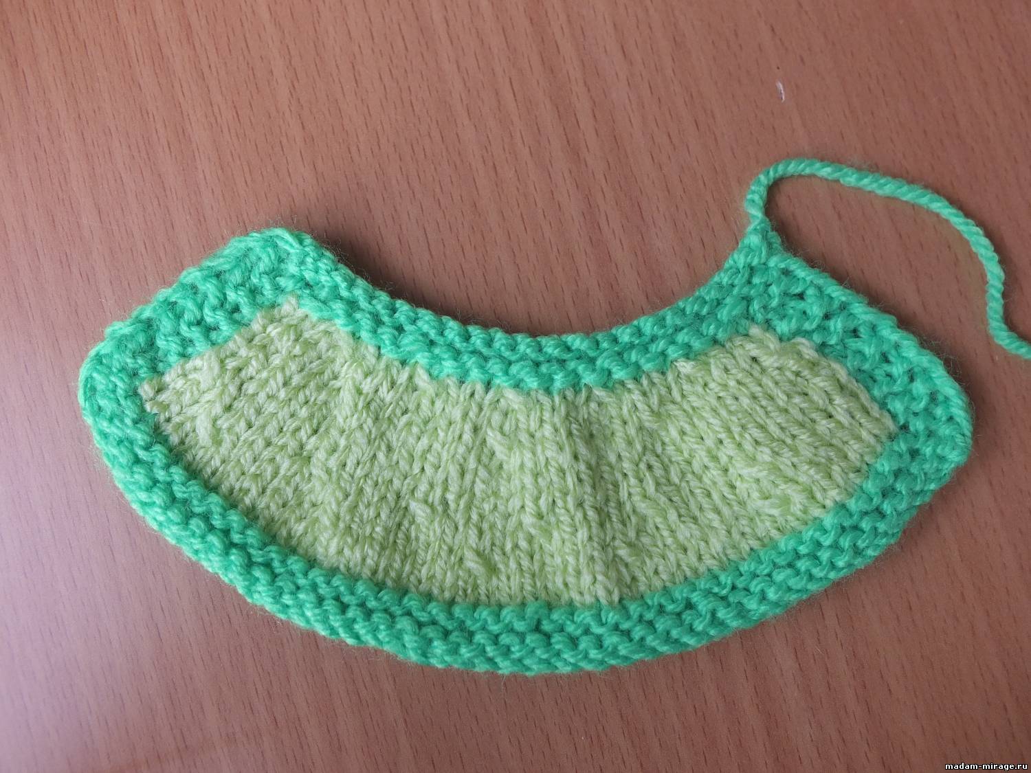 Вязать будем сразу светло салатовым и темно салатовым цветом. Вяжем прямым полотном не замыкая в круг. Напомню, для тех кто вязал на 4х СП., что вязание на 2х СП. Получается чуть больше ,поэтому курточку в процессе вязания примеряйте. Цвета меняйте перекрещивая нити так не будет узлов. *Темно салатовым цветом будем вязать платочной вязкой * Светло салатовым лицевой гладью. У меня получилось так: Набрать темно салатовым цветом 41п.+ 2 кр. 1-3 р.- платочная вязка. 4р.- кр, 2п, меняем на светло салатовый 37п, 2п.темно сал.,кр. 5-6, 8р.- так же 7р.- кр, 2п тем.сал, свет.лат-(5п, уб)-5 раз,2п, 2п тем.сал,кр.=38п. 9р.- кр, 2п тем.сал, свет.лат-(4п, уб), (3п,уб)-4 раза, (4п, уб), 2п тем.сал,кр.=32п. 10р.- кр, 2п тем.сал, свет.лат.-26п, 2п тем.сал,кр.=32п. 11,12р. Так же. 13р.- кр, 2п тем.сал, свет.лат.-уб, 4п, уб, 5п, уб,5п, уб, 4п, 2п тем.сал,кр.=28п. 14р.- кр, 2п тем.сал, свет.лат-22п, 2п тем.сал,кр.=28п. 15р.- темно салатовым цветом вяжет. Кр, 2п, (2п, уб)- 5 раз, 4п,кр =23п. 16-17р.- кр, 2 изн, 17лиц.п, 2 изн,кр.=23п. 18р.- закрыть лиц.п, с изн.стороны. изн.сторона лиц.сторона
