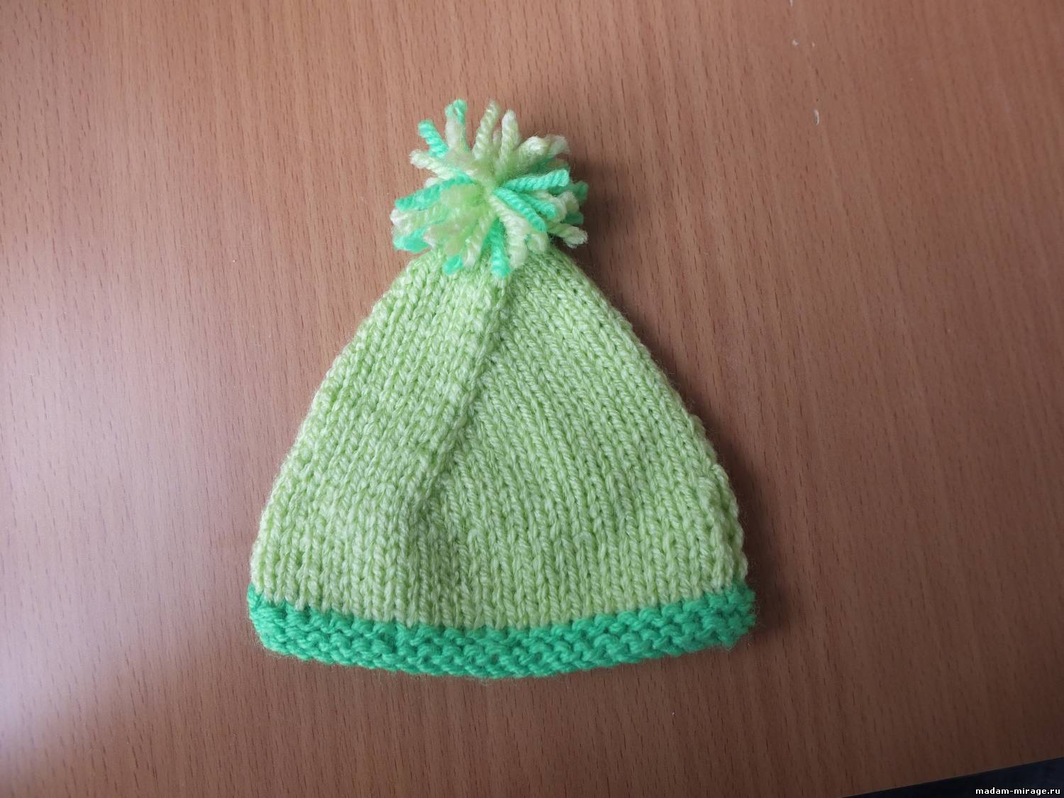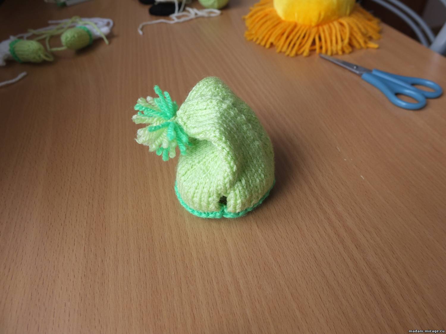Для 4х сп. Темно салатовым цветом набрать 48п.(это отделка) 1-3р.- платочная вязка. Меняем цвет на светло салатовый и вяжем с 4 – 11р.- лицевой гладью по 24п. 2 части. Для 2х спиц. Темно салатовым цветом набрать 24п. Или наберите 48п.(тогда вы будите зашивать только с 1ой стороны нашу отделочку.) 1-3р.- платочная вязка. Меняем цвет на светло салатовый и вяжем с 4 – 11р.- лицевой гладью по 24п. 2 части. Теперь соединяем обе половинки. Для 4х СП. Вяжем по кругу , (для 2х СП. Соединяем только с 1ой стороны и вяжем лиц.гладью). Для тех кто уменьшал одну половинку шапки: в этом ряду вы должны прибавить петли до 48. 12р.- 48п. 13р. – ( 14 лиц,уб)- 3 раза =45п. 14,16,18,20…четные р.-лиц.п. ( для 2х СП. Изн.п все четные ряды.) 15р.- ( 13 лиц,уб)- 3 раза =42п. 17р.- ( 12 лиц,уб)- 3 раза =39п. 19р.- ( 11 лиц,уб)- 3 раза = 36п. 21р.- ( 10 лиц,уб)- 3 раза =33п. 23р.- ( 9лиц,уб)- 3 раза =30п. 25р.- ( 8 лиц,уб)- 3 раза =27п. 27р.- ( 7 лиц,уб)- 3 раза =24п. 29р.- ( 6 лиц,уб)- 3 раза =21п. 31р.- ( 5 лиц,уб)- 3 раза =18п. 32р.- ( 4 лиц,уб)- 3 раза =15п. 33р.- ( 3 лиц,уб)- 3 раза =12п. 34р.- ( 2 лиц,уб)- 3 раза =9п. 35р.- ( 1 лиц,уб)- 3 раза =6п. Петли собрать на нить, стянуть и пришить кисточку. Кто вязал на 2х СП. Сшить с боку.