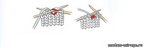 В начале раппорта прибавляем петлю следующим образом: Прибавление в конце раппорта: Если совершенно не получается прибавлять этими способами просто делайте в нужном месте скрещенный накид.- 2 п. вм. – две петли лиц вместе.