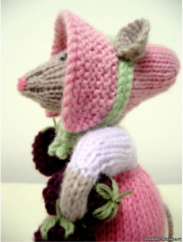 Сборка мыши Бетти с ежевикой Пришить голову к телу.Светло-розовым вышить нос тремя горизонтальными стежками, затем вышить рот одним стежком, отступив немного. Отметить позиции глаз булавками. Вышить глаза тамбурным швом, сделав 4 стежка по кругу черным цветом, затем белой нитью сделать маленький стежок в центре глаза для блика. Можно пришить или приклеить бусинки, свалять глазки из шерсти… Стопы пришить к юбке. Набить верхушку капора, одеть на голову. Пришить швом назад иголку за последний лицевой ряд поля и вокруг заднего открытого края верха. Обернуть и приклеить ленту вокруг головы. Сшить концы под подбородком, затем сделать бантик и пришить. Пришить одну ягоду к правой руке и две к левой.