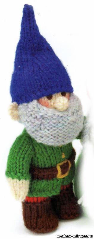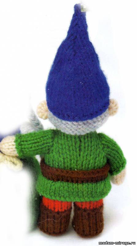 Сборка Собрать на нить каждую петлю по наборному краю ботиночек, сильно стянуть, закрепить. Затем сшить каждую ногу до маркеров, далее сшить деталь до первого ряда туники, маркеры удалить. Начиная от верхней точки головы, сшить голову. Набить деталь плотно, затем зашить оставшуюся открытой часть до конца. Протянуть нить сквозь петли в прибавочном ряду основания головы, стянуть, придавая форму шее и надежно закрепить нить. Деталь низа туники обернуть вокруг талии и присоединить боковые кромки пояса в центре передней части тела изнаночной стороной на лицо. Пришить деталь следующим образом: первый ряд пояса пришить поверх первого ряда туники. Используя остатки золотой пряжи, вышить пряжку над поясом четырьмя прямыми стежками. Затем французскими узелками сделать три кнопки равномерно расположенных вниз по передней части туники. Сшить руки до окатов рукавов, затем используя пинцет, слегка набить деталь и пришить руки слева и справа от тела близко к шее. С помощью маркеров наметить положение глаз - 9 рядов выше прибавочного ряда головы и 2 петли между глазами. Используя нить шоколадного цвета вышить крошечные горизонтальные стежки для каждого глаза и удалить маркеры. Соединить края детали носа. Деталь плотно набить, формируя небольшой шарик, пришить на лицо. Сделать румянец на щечках. Совместить края шляпы и сшить. Надеть шляпу на голову швом в центре спины и прямо над глазами гнома. Пришить к голове. Обернуть волосы сзади головы и пришить. Затем пришить уши по бокам головы поместив непосредственно ниже базового края шляпы с интервалом 3 петли от каждого глаза и близко к волосам. Сшить кусочки бороды. Разместить бороду на лице прямо под носом и пришить на место несколькими стежками.