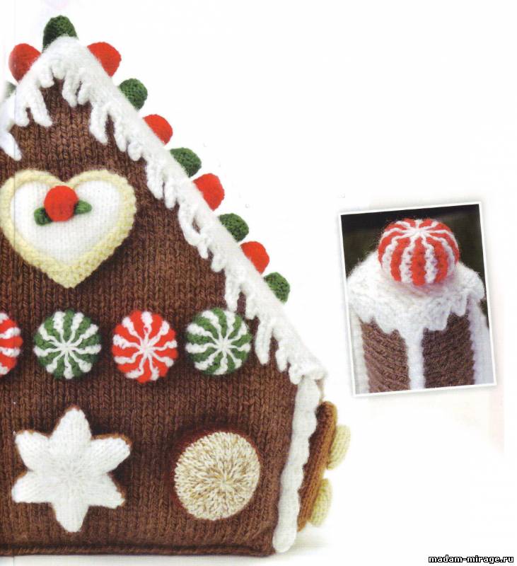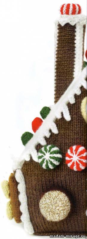 Сборка пряничного домика Соединять детали матрасным швом (если не указано иное). Соединить набранный и закрытый края крыши. Соединить переднюю и заднюю части домика к боковым частям по соответствующим маркерам. Затем маркеры удалить. Вырезать из картона прямоугольник размером 15х22 см (лучше измерить основание своего домика) и приклеить на изнаночную сторону (внутренняя сторона домика) сделанный прямоугольник из картона. Вырезать из картона 2 прямоугольника размером 15х44 см для скатов крыши. Приклеить их с изнаночной стороны крыши. Домик набить. Теперь присоединить переднюю часть домика до верхней точки (конек) крыши, затем заднюю часть. Соединить набранный и закрытый края дымохода вместе. Отрезать 2 трубочки длиной 9 см и 2 трубочки длиной 14 см (откорректировать всоответствии со своими размерами). Приклеить их с изнаночной стороны к каждой соответствующей по длине белой части дымохода для придания жесткости. Пришить верхнюю деталь дымохода к трубе. (В описании не указано, но я полагаю дымоход нужно набить). Расположить дымоход на правой стороне крыши следующим образом. Отсчитать от нижнего края крыши 32 ряда и прикрепить дымоход длиной частью к крыше при помощи булавок. Короткий край дымохода крепится через 14 рядов вверх. Найти середину крыши (16 петель + 16 петель) и середину дымохода (4 ряда+4 ряда) – закрепить булавкой. Убедиться в правильном выборе положения дымохода и пришить. Присоединить к верху дымохода окантовку «снега». Пришить водостоки к каждому углу домика. Найти центр каждой окантовки-сосульки и закрепить на верхней точке крыши сзади и спереди домика. Затем пришить кант по краю крыши. Побрызгать окантовку лаком для волос, с помощью пальцев выпрямить каждую маленькую сосульку, дать высохнуть.Добавлено (13.01.2014, 18:44) --------------------------------------------- Девочки, вот и второй этап, он большой, после него останется только декор домика, легких петелек
