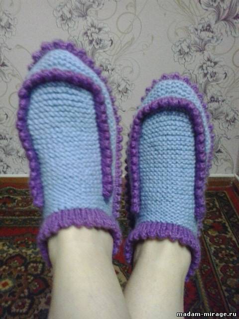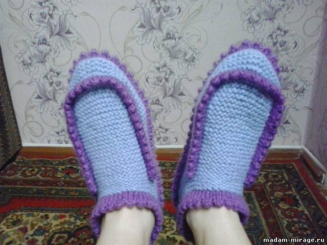 | Всем привет, Света принимай мои тапочки.  Вот что у меня получилось. А украшать я их не стала, они мне и так нравятся. Такие тепленькие и удобные. Спасибо Светочка за онлайн. А я пожалуй пойду еще парочку тапок свяжу, кому нибудь на подарочек.