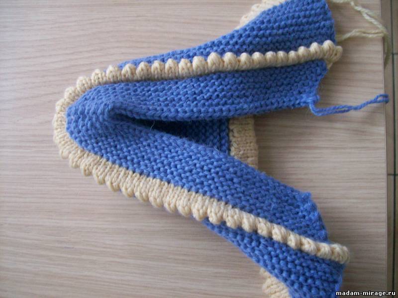 Переходим на подошву которую вяжем вторым цветом платочной вязкой когда начинаешь вязать подошву.нужно убавлять в каждом втором ряду первые две петли вместе..потом две вместе перед центральной петлёй..провязываем центральную петлю и опять две вместе и две последние вместе."